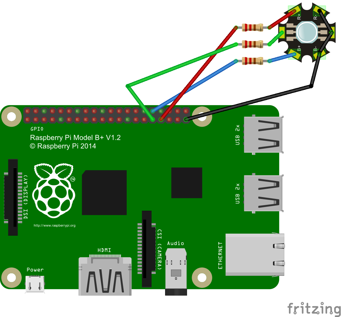 Egy RGB LED a Raspberry Pi-re kötve a lenti rajzon látható módon: