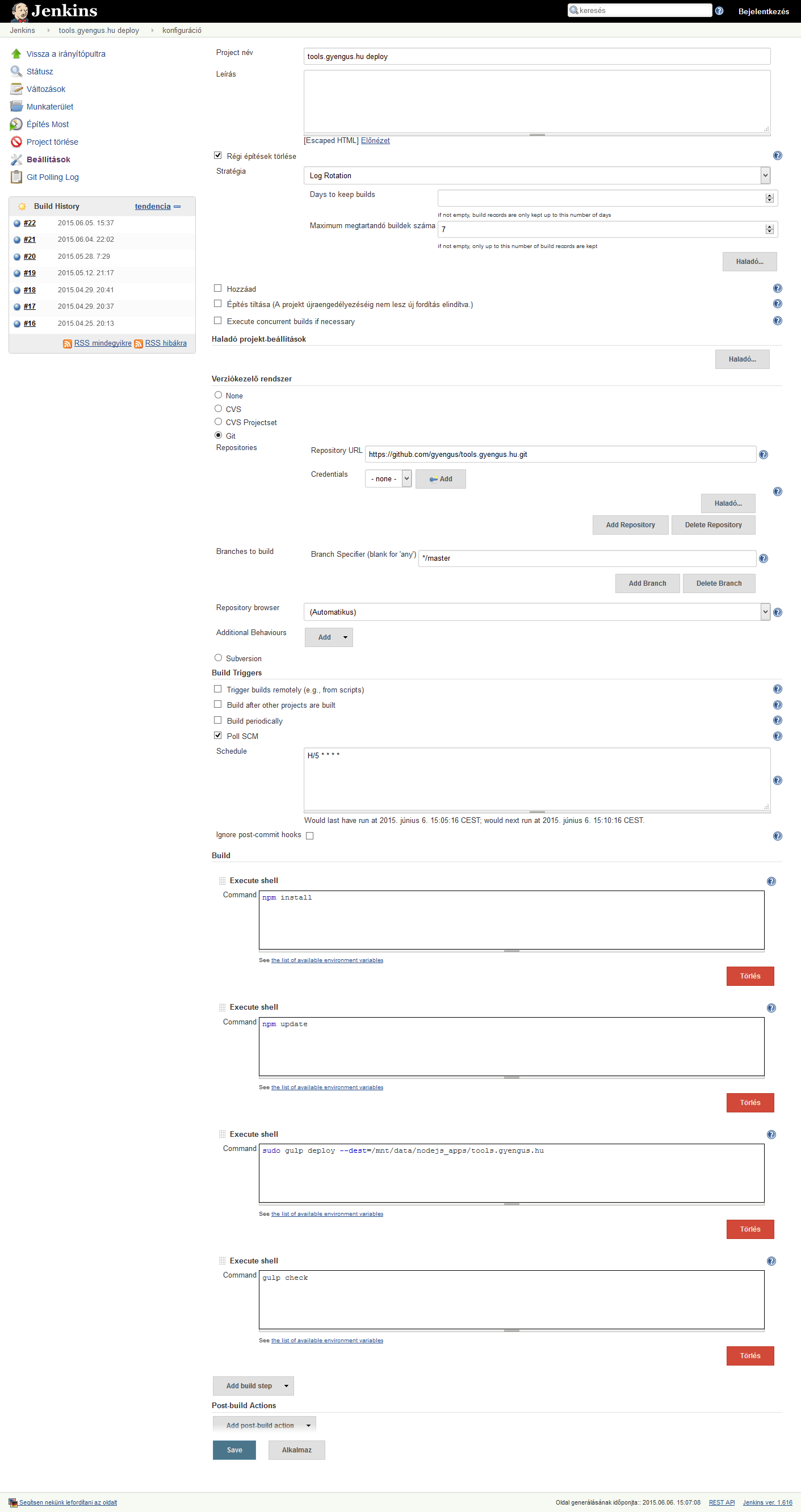 A verziókezelő rendszernél ki kell választani a Git-et. Meg kell adni a Node.js alkalmazás repositoryjának linkjét. A "Poll SCM" beállítást bepipáljuk, az ütemezéshez "H/5 * * * *"-ot írva, a Jenkins 5 percenként fogja ellenőrizni, hogy módosultak-e a fájlok. Amennyiben volt commit, elindítja a build folyamatot, ami a következőképpen néz ki jelen esetben: