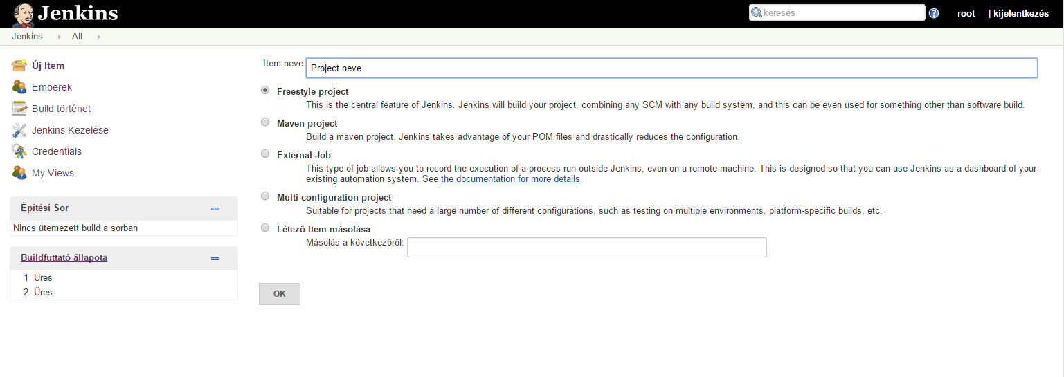 A Jenkins főoldalán hozzunk létre egy új elemet: