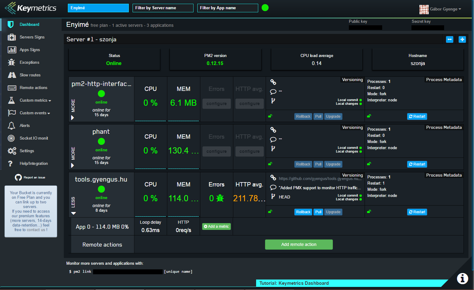 Amennyiben regisztrálunk a Keymetrics oldalon, kapunk egy webes felületet sok szép grafikonnal, ezt 2 szerverig ingyenesen használhatjuk.