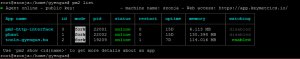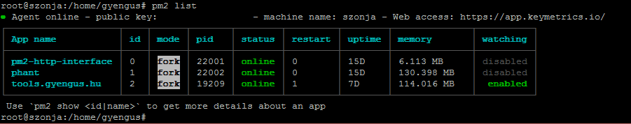 Konzolon belépve a pm2 list parancs segítségével kérhetjük le a futó alkalmazások listáját: