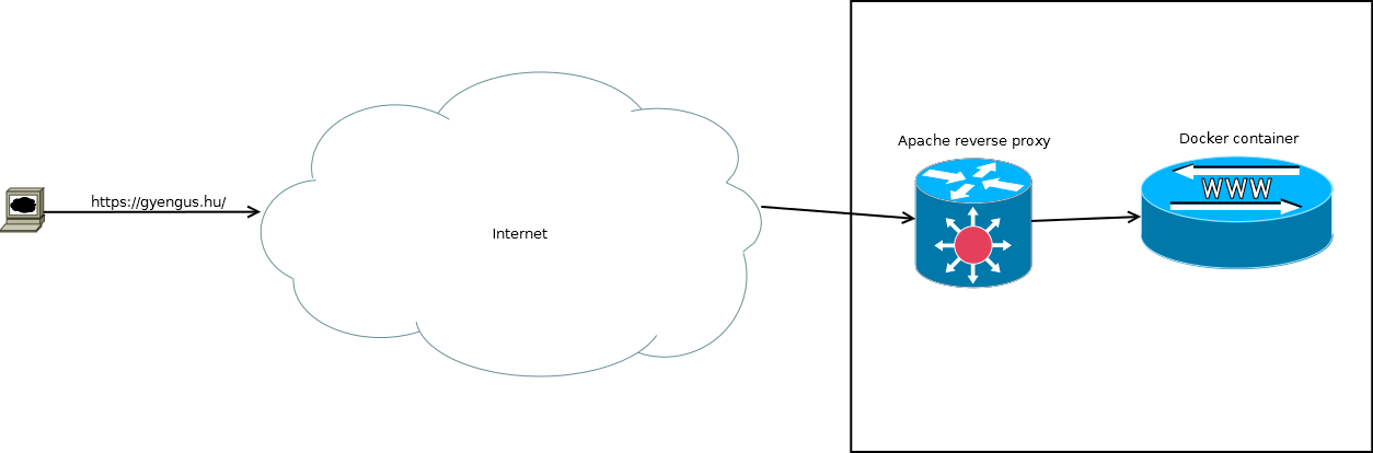 Most, hogy már van egy futó konténer ami a gazda gép 8888-as portján figyel, irányítsuk rá a forgalmat! Mivel az Apache fel van telepítve, kézenfekvő azt használni proxynak. Egy egyszerű reverse proxyt kell beállítani.